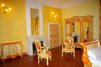 Une savante composition entre mobilier ancien et tentures baroques, dont les motifs sont repeints sur les portes et volets |