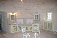 | Nous avons créé une impression d' espace par un contraste volontaire des murs dans les bleu-gris; assorti de mobilier peint, style L15, décor d'inspiration François boucher