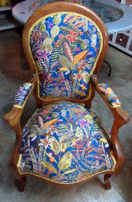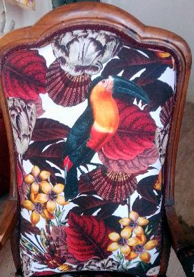 superbe fauteuil louis phlippe trefle ancien, tissus décor toucan,refction,guindage,mousse