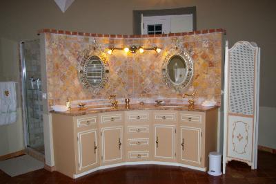 | sobriéte, blanc et bordeau pour ce petit espacede 3MX2m | Ici, l'espace salle de bain s'aacentue autour du meuble henri 11 relooké, les carrelages décorés par B.C |