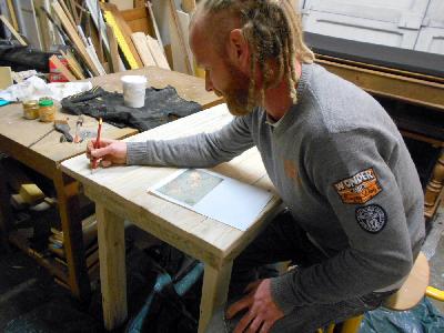 | séance de dessin pour pierre, carte du monde et personalisation de sa table en palettes