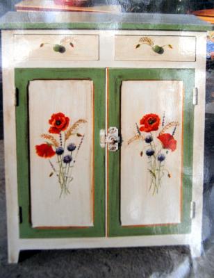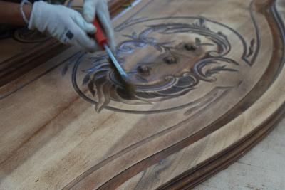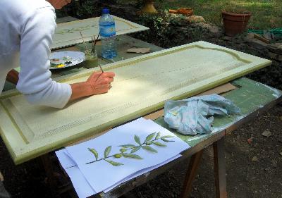 | Apres le décapage, la céruse, la peinture et patine, réalisation du décor par une totale néophyte, après initiation