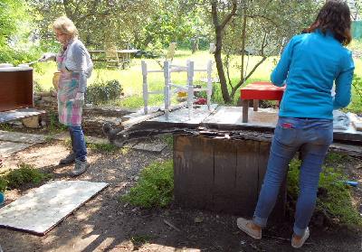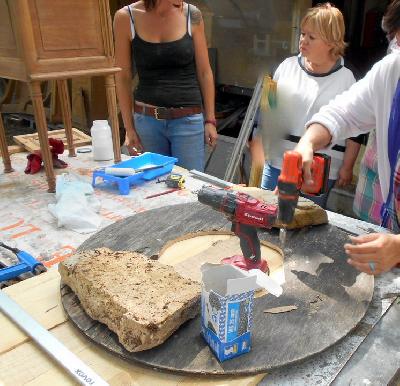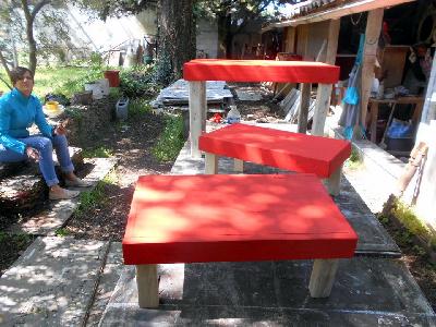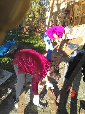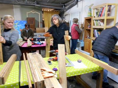 | lesle raffinement a la basquaise: les chaises coordonnées...;peinture farine réalisée la veille | notre future artisane,( les meubles de maya) | .JPG) | .JPG) | .JPG) | oui, super réussi! | fabrication de la chaise en palette | les décontamineurs!!parceque ce métier comporte également certaines contraintes essentielles | .JPG) | .JPG) | .JPG) | l'effervescence de l atelier, apres le mobilier, la table;; la chaise, les stagaires sont préts a aborder le recyclage de mobilier pour leurs stocks(les mobiliers en palettes en font partie) | la base! les bonnes cotes, la concentration | apprentissage de la manipulation de la meuleuse | .JPG) | .JPG) | .JPG) | normes de sécurité,de protection pour les préparation de bois. | le bois va etre poncé a blanc | les mobiliers de palettes crée vont passer a une finition poncage,apres masticage | | | | .JPG) | .JPG) | .JPG) | voici, les meubles de nos basquaises ,en bois de palettes, avant finitions(et 3m2 de bois économisé) | multiplié par nos 6 stagaires soit, 20m2 e bois réutilisés | seconde semaine de formation et maitrise de l outillage de base | %20[HDTV%20(720)].JPG) | %20[HDTV%20(720)].JPG) | %20[HDTV%20(720)].jpg) | concertation pour un assemblage | consternation!! encore une benne de mobiliers parmis des milliers, qui est vouée au bois de chauffage, alors que nous aurions pu le récupérér pour nos créateurs eco recycleurs.. non, l'industrie n est pas écolo. | journée solidaires, la dépaletisation commune |