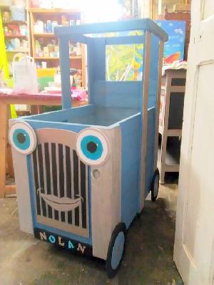 | et résultat de nos récupération buffant!la voiture berceau de Sandrine | étude de création de mobilier pour enfants en bois recyclés et peintures naturelles