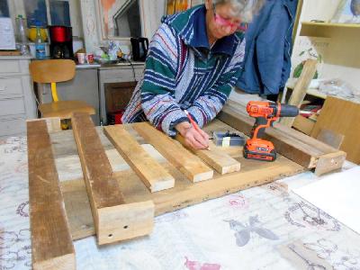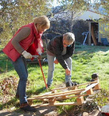 | création en cours du berceau palettes de Sandrine | mini lola surveille la guindage de Marie pierre